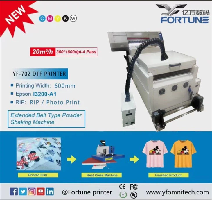 Tiskalnik YF-702 DTF (Direct to Film) je vrhunski termalni tiskalnik, opremljen z dvema tiskalnima glavama I3200A1, ki ustvarjata osupljivo živahne barve in visokokakovostne natise. Integrirana vakuumska platforma tiskalnika zagotavlja, da so materiali med tiskanjem ravni in stabilni, kar prispeva k natančnim podrobnostim tiskalnega posla.